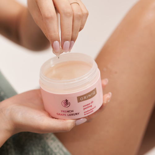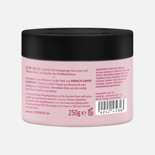 Das körnige Meersalz unseres FRENCH GRAPE LUXURY Creme-Öl-Peelings entfernt abgestorbene Hautschüppchen intensiv und sorgt für ein weiches Hautgefühl. Die seidig-leichte Duftkomposition nach weißer Traube und Iris schmiegt sich bei der Anwendung an die Haut und bezaubert die Sinne. Ein echter Wellness-Moment im Alltag!